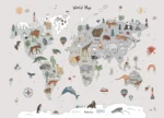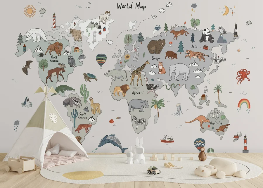 Custom Size Wall Mural Grey Animals World Map Doodle | Premium Non-Woven Wallpaper | FTD5P 352449