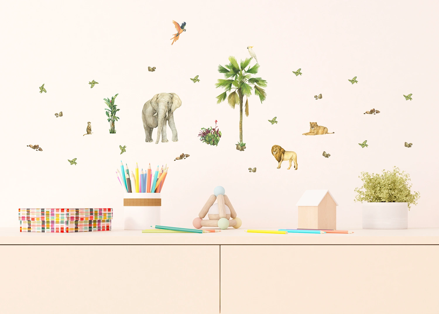 Explore different Jungle scenes and its adorable habitants with our charming designs, which are tailored to captivate any child. Crafted with love, each sticker adds a sprinkle of magic to your child’s room. Alongside our Jungle wall stickers, explore our range of textile products, wall borders, and murals to complement the theme seamlessly.