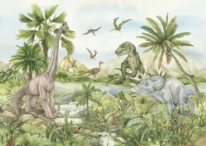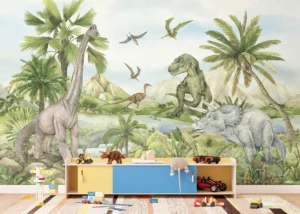 Step into prehistoric adventure right in your child’s room with our delightful Dino wall mural! Designed to infuse warmth and joy into their space, these photomurals bring a playful touch to any kid’s haven. Bring your little explorer into a land of ancient wonders and colossal creatures, igniting their imagination and love for different dinosaurs!