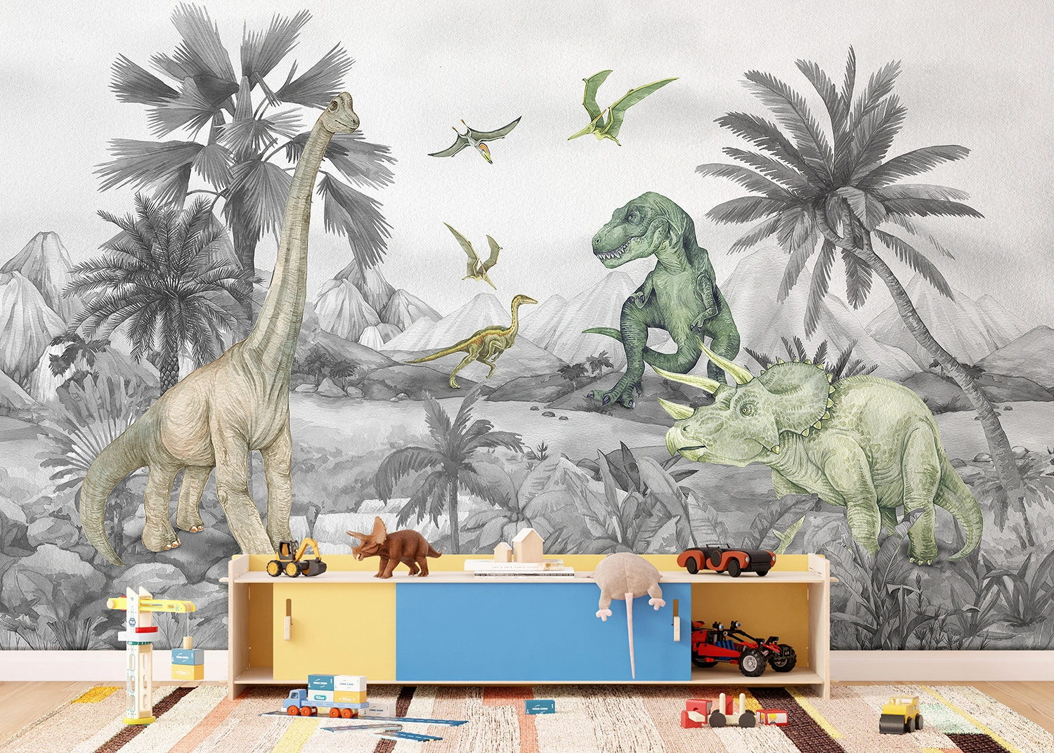 Step into prehistoric adventure right in your child’s room with our delightful Dino wall mural! Designed to infuse warmth and joy into their space, these photomurals bring a playful touch to any kid’s haven. Bring your little explorer into a land of ancient wonders and colossal creatures, igniting their imagination and love for different dinosaurs!