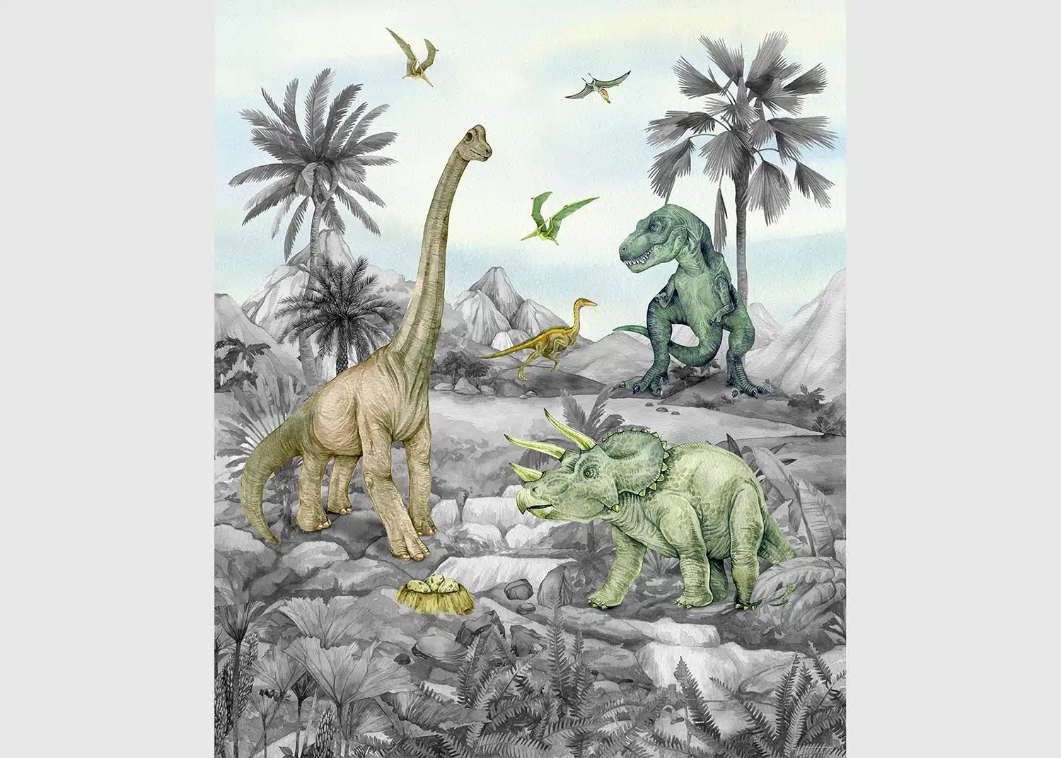 Step into prehistoric adventure right in your child’s room with our delightful Dino wall mural! Designed to infuse warmth and joy into their space, these photomurals bring a playful touch to any kid’s haven. Bring your little explorer into a land of ancient wonders and colossal creatures, igniting their imagination and love for different dinosaurs!