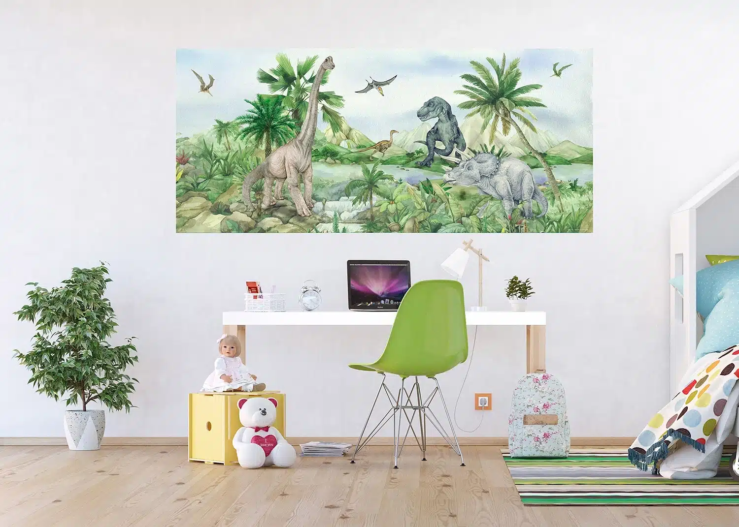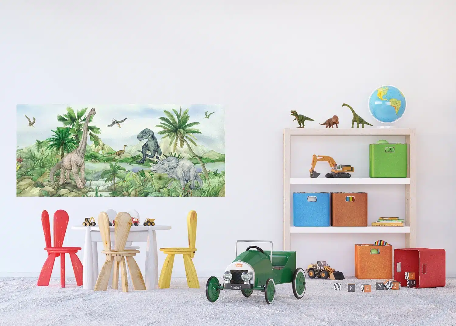 Step into prehistoric adventure right in your child’s room with our delightful Dino wall mural! Designed to infuse warmth and joy into their space, these photomurals bring a playful touch to any kid’s haven. Bring your little explorer into a land of ancient wonders and colossal creatures, igniting their imagination and love for different dinosaurs!